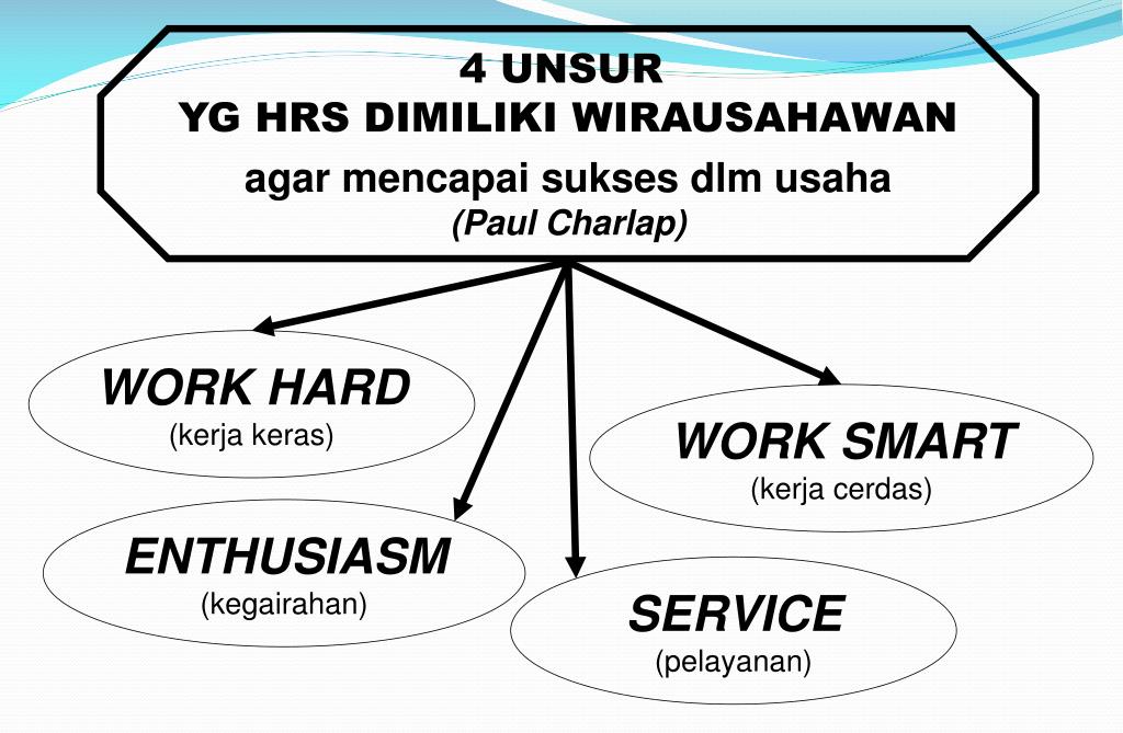 Pos tentang 4 unsur peluang usaha menurut paul charlap yang ditulis oleh. Jawaban terverifikasi ahli · work hard (kerja keras) · work smart (kerja cerdas) · enthusiasm (kegairahan) · service (pelayanan) . Berikut ini yang bukan merupakan unsur dimiliki wirausaha agar mencapai sukses dalam pekerjaannya menurut paul charlap adalah… Menurut paul charlap yang mengemukakan sebuah rumusan yang mencakup 4 (empat) unsur yang harus dimiliki seorang wirausahawan agar mencapai . Setelah seorang wirausaha mewujudkan ide dan peluang usaha tersebut .